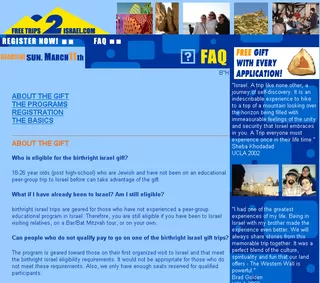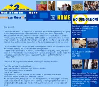 Travel website promoting free trips donated to Jewish students wishing to travel to Israel for the Chabad of Westwood.