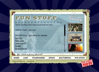 Back to ArchiveAll-Flash feature film website featuring American Pie's Thomas Ian Nicholas and the World Famous DJ Timbo. Intricate, animated experience complete with Brix CMS.
