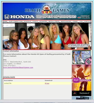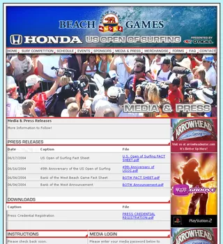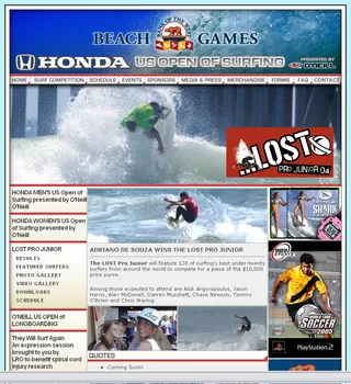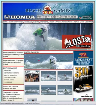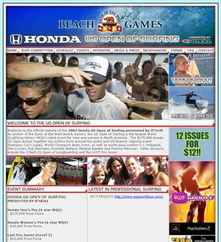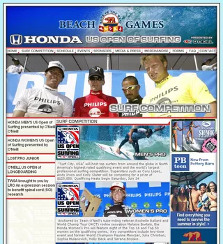 Hybrid HTML / Flash event website for surf competition featuring Kelly Slater and Andy Irons sponsored by Honda and O'Neill complete with schedules, events, media, merch as well as handling inbound inquiries.